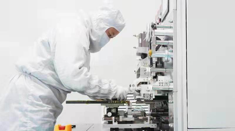 ? ? ? ? 2月9日,高新區(qū)松柏電子生產(chǎn)車(chē)間,2名工人合力將一張86寸觸摸屏移下操作平臺(tái)。