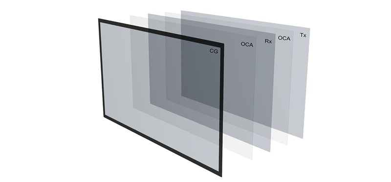 例如我司產(chǎn)品采用的是金屬網(wǎng)格GFF的貼合方式,表層是玻璃,底部是光學(xué)膠+Rx電極和光學(xué)膠+Tx電極貼合而成。